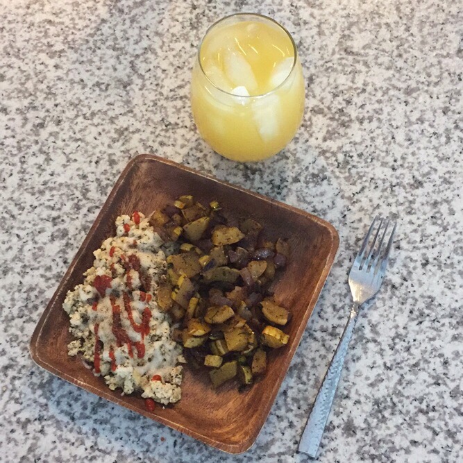 Don’t knock it until you try it. Tofu is so versatile, it hardly has a taste so you can turn it into whatever you are in the mood for! Add a little ghee (clarified butter) and some tomato basil spice and voila! Perfect scrambled “eggs.” To top it off I added almond mozzarella (The only cheese alternative I have found that actually melts!) and siracha. I recently discovered delicata squash – the perfect food. It’s flavor reminds you of sweet potato and corn! Leave the skin on when you cook it (bake or sauté), it melts in your mouth! This is a seasonal winter squash so get what you can now!