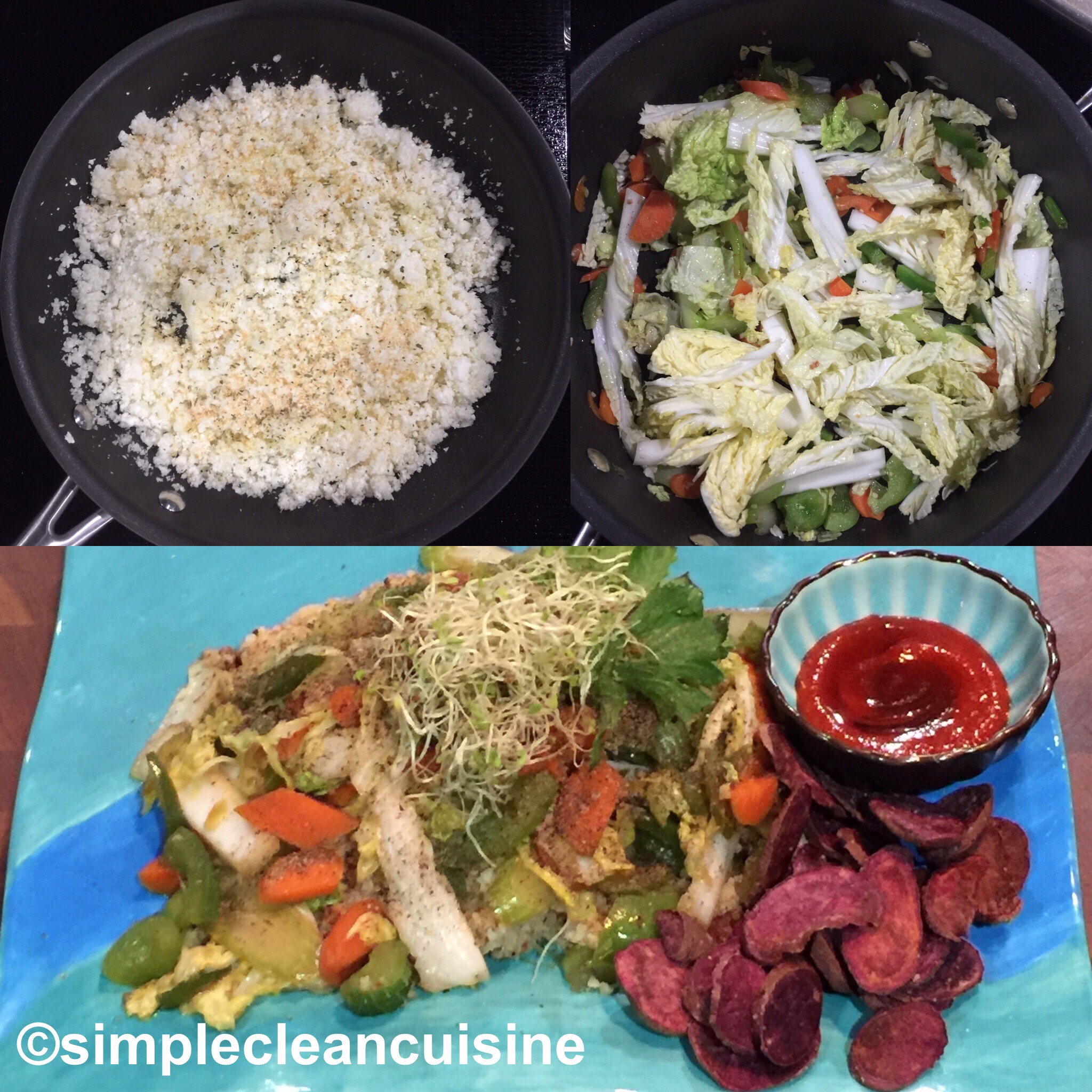 Simple little stir fry. Use cauliflower rice as the base and top with sautéed green pepper, spring onion, carrots, celery and napa cabbage. I sauteed the veggies very quickly in coconut oil for that sweet nutty flavor, and finished it off with 1/4 cup amino acids, 1 tablespoon organic agave and 1/2 teaspoon minced ginger. I also added 1/2 tablespoon of minced garlic to the rice. I had some organic mini purple sweet potatoes on hand so I baked them and used them for the crunch instead of wonton chips. Add a little siricha/agave dip on the side to spice it all up!
