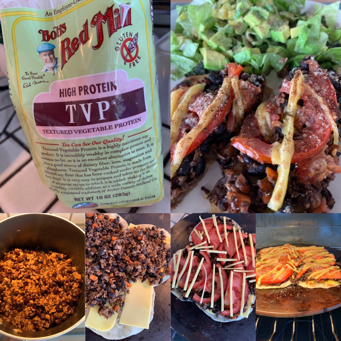 I prepared some black beans yesterday with no plans what to do with them. Came across this TVP today and thought I would give it a try. Textured vegetable protein is basically dried soy. It comes in flakes and you can add to anything to give it a meaty texture. I threw some into a pot of black beans I reheated, along with sautéed carrots and onion with some fresh garlic. I made some mini pizzas by using the bean combo on top cashew flour wraps. I used almond cheese and finished it off with tomato slices. This dish is very filling and not something I’d eat everyday – but clean and yummy!!!