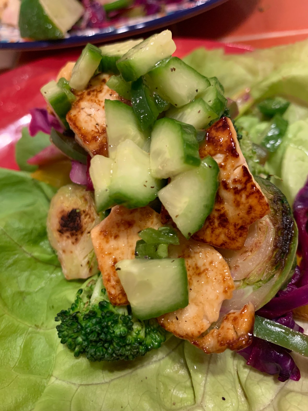 I put a special twist on this lettuce wrap by adding golden beets for earthiness, mango chutney marinated Tofu for the sweet and jalapeño/cucumber salsa for the heat.