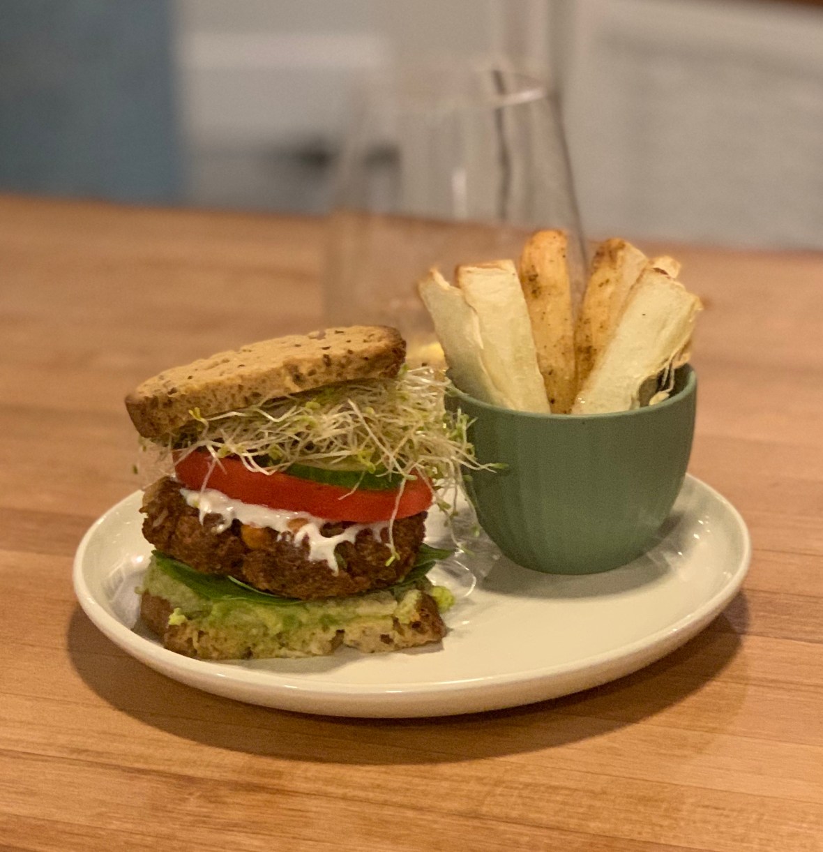 I decided to put mine on top of gluten-free Ryebread and I added avocado and horseradish along with tomatoes, spinach, cucumber, and sprouts. On the side, the most delicious “fries” I’ve ever had – air fried yuca in a truffle lemon vinaigrette dip. 😳 So good!