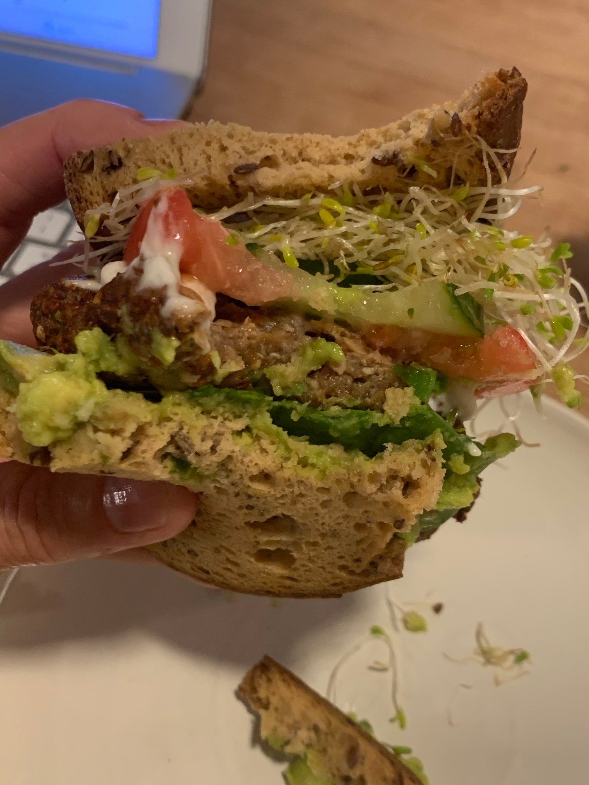I created this fancy little vegan vegetarian (there is a difference) burger. It’s easier just to give you the ingredients to talk you through it.
