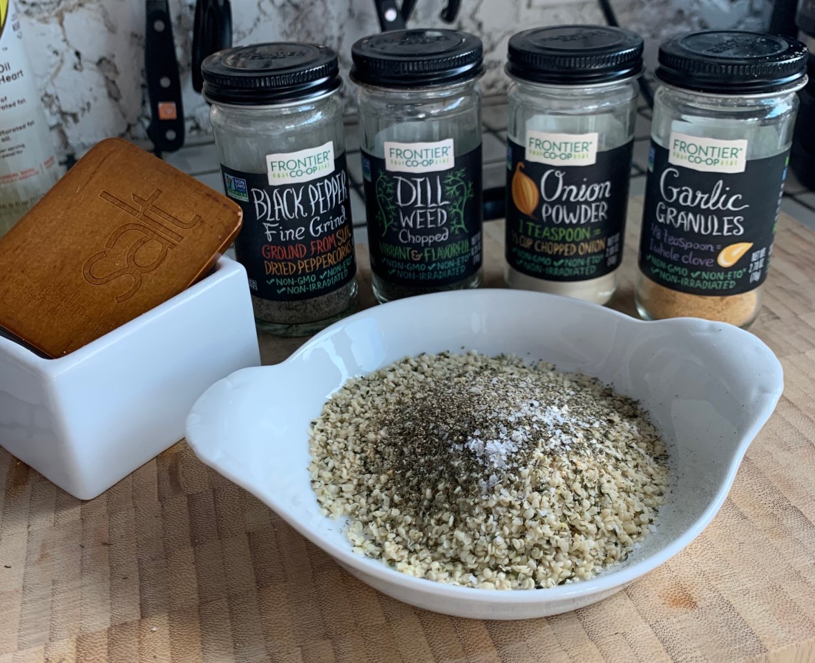 Next, cut the tofu in strips or cubes, drench both sides with leftover chickpea liquid and then coat in a mixture of hemp seeds, dill, salt, pepper, onion powder and garlic granulas.