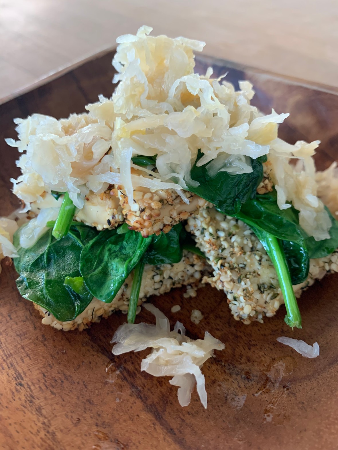 Stack the tofu with layers of spinach in between. Now, let’s keep that gut healthy and top with, my fav, sauerkraut!