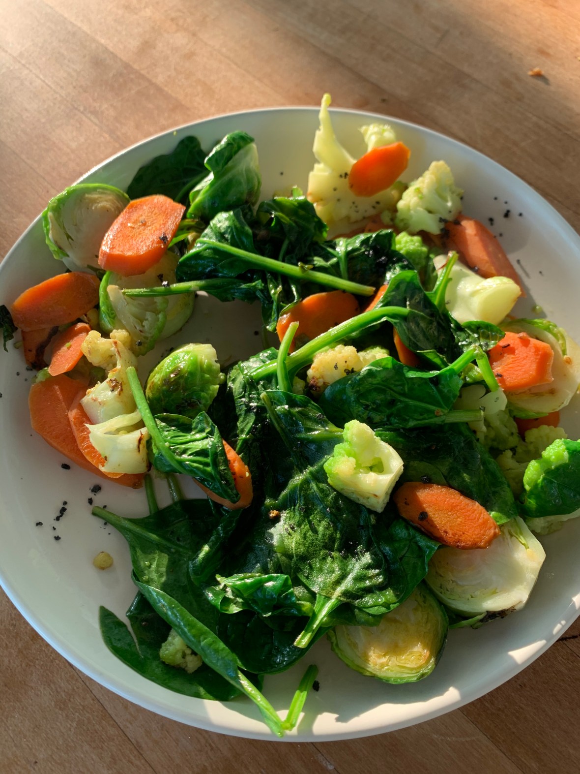 Just eat what you like for breakfast!! Sometimes I struggle trying to figure out what to eat for breakfast, it has to be “breakfast food”, doesn’t it? Tofu, toast, fruit…. Sometimes, I’m just in the mood for my vegetables, and sometimes doing what you’re in the mood to do is the best thing for your soul by helping you remain “content”. And, perfect timing, because I’m low on a lot of things so I can clean out the drawer and go grocery shopping knowing I’m replenishing my veggie stock from a clean slate today!