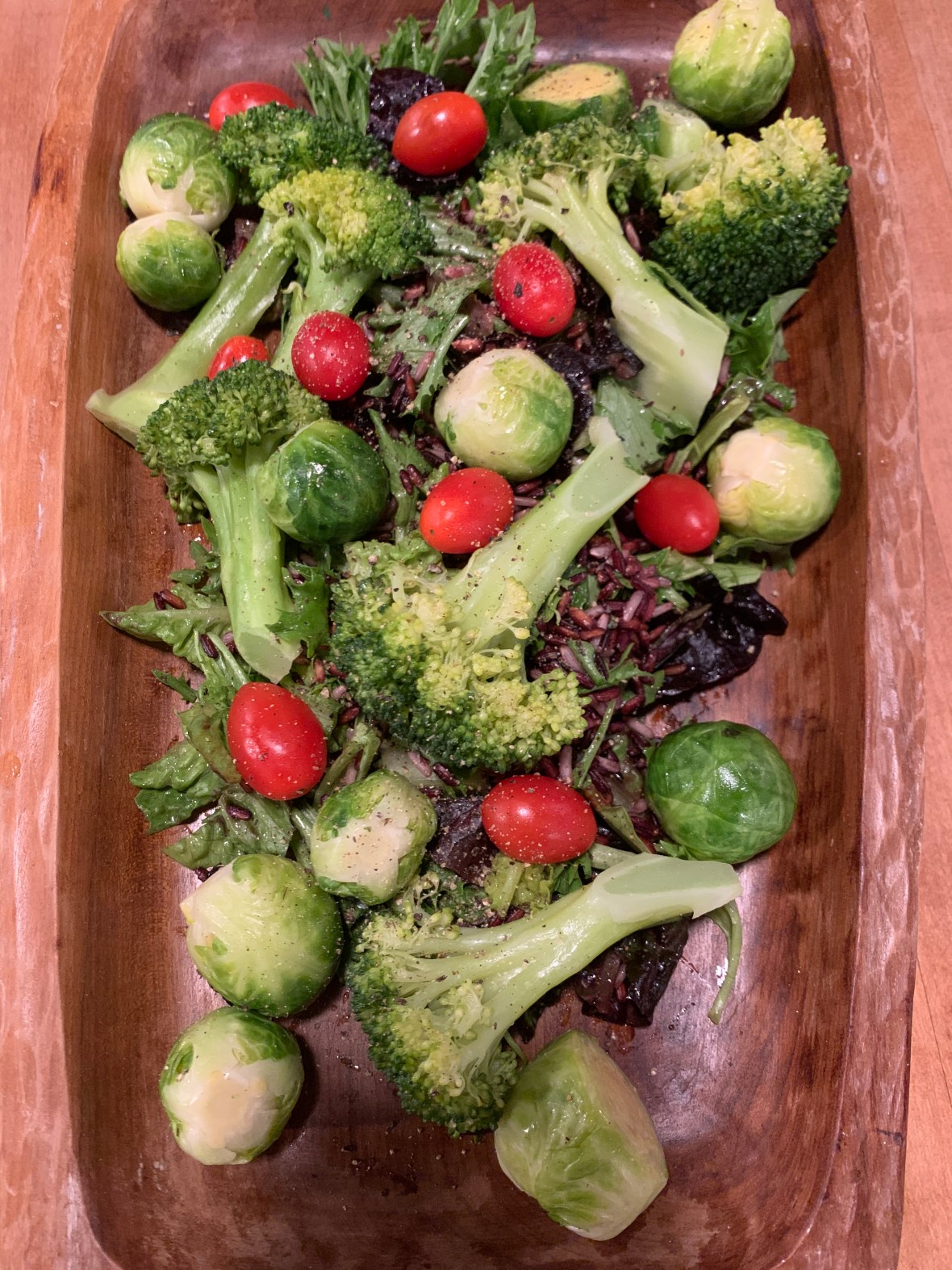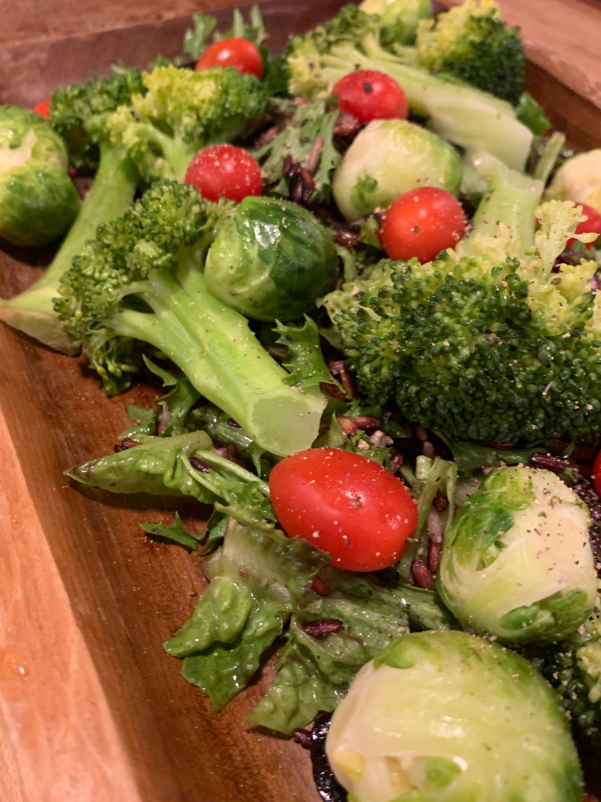 So I grabbed all the favorite ingredients I saw in front of me. Broccoli, Brussel sprouts, a variety of baby lettuce and sweet cherry tomatoes. When I plopped this all down on the counter I knew immediately I didn’t want to make an ordinary salad, and I’ve been craving wild red rice.
