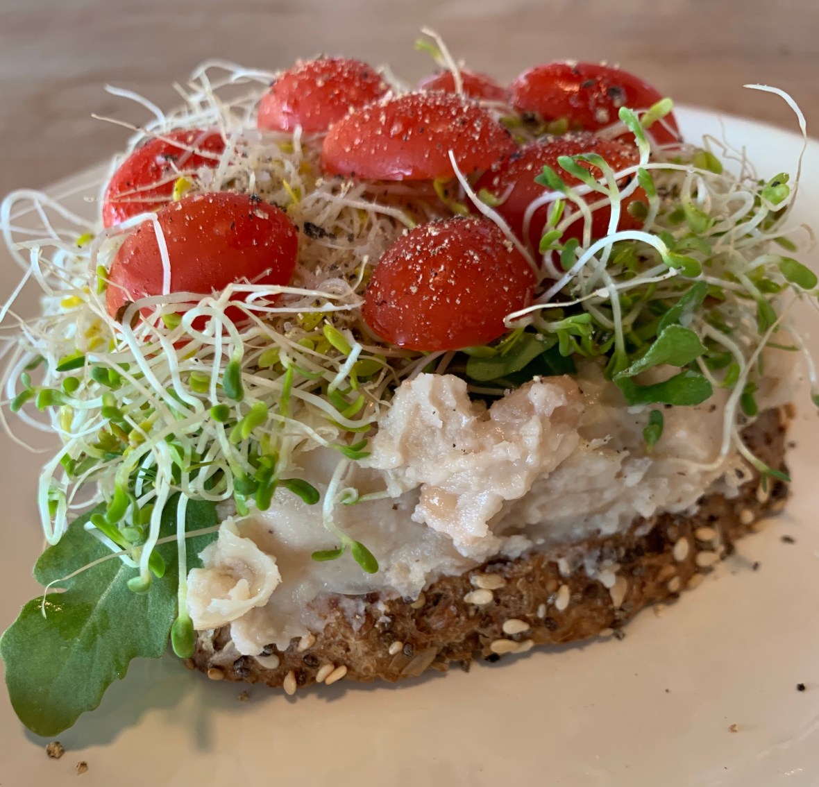 My version today is Ezekiel toast, canelli beans smashed and also some whole, arugula, sprouts and some cherry tomatoes. A sprinkle of salt and pepper. Quick, simple and full of vitamins, minerals and plant based protein!