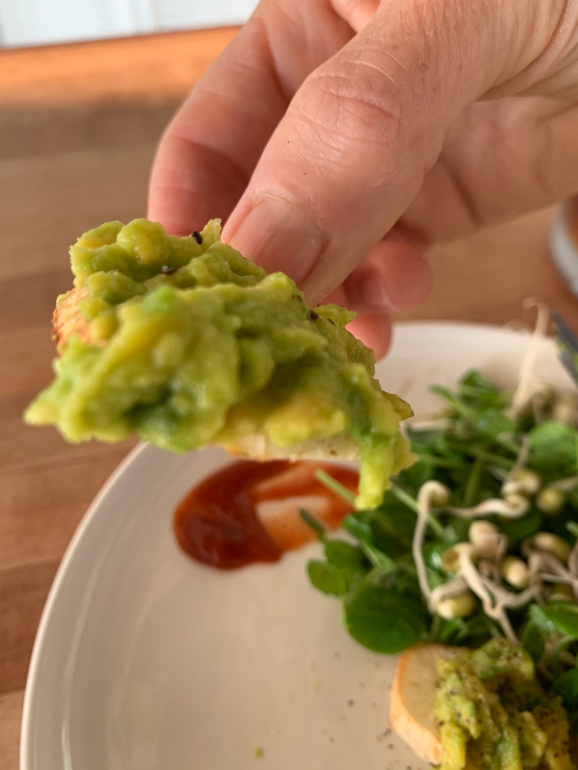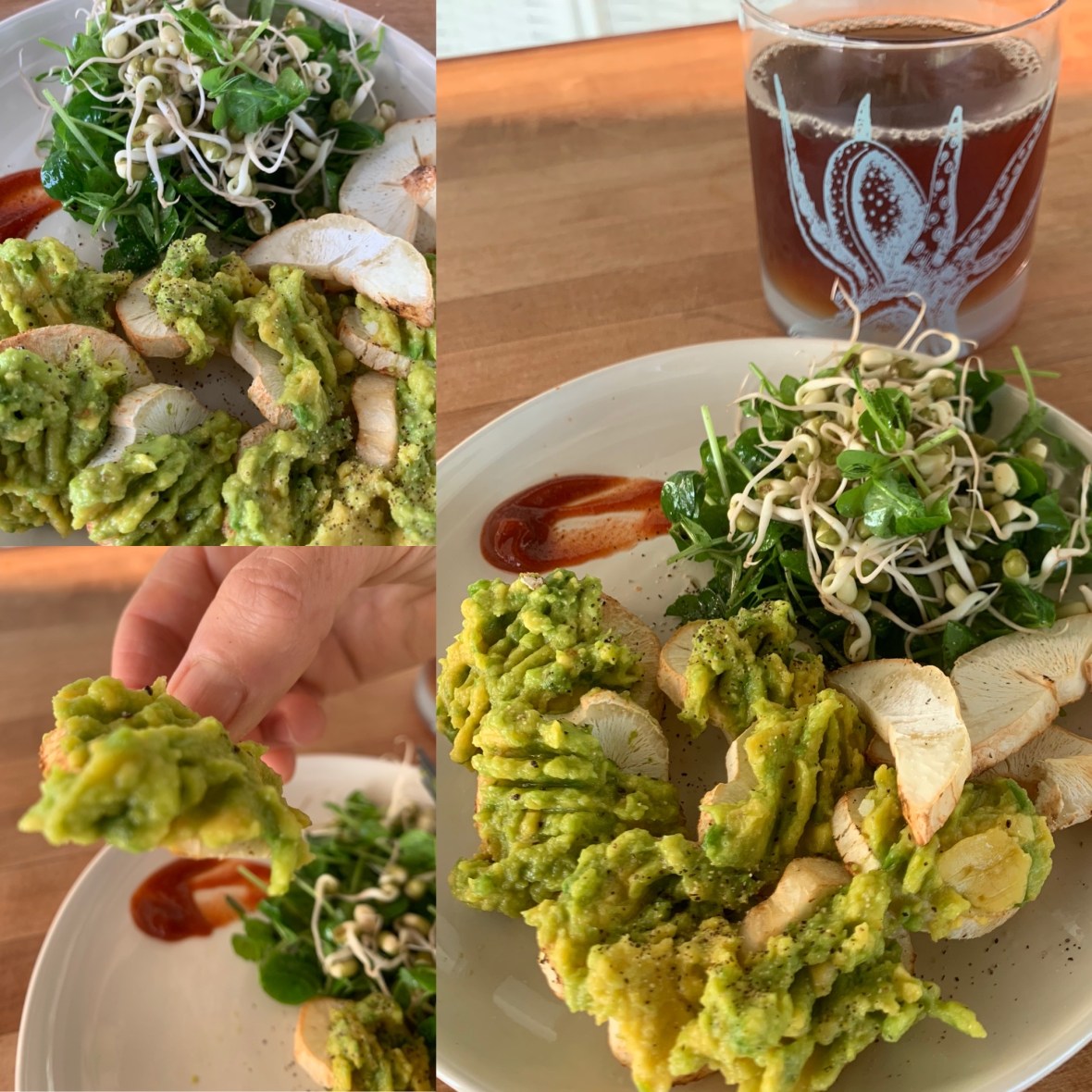 Fresh pea tendrils & mung beans jumped out at me this morning, so I sat them on the counter and thought….how do I incorporate these into a breakfast? Then I remembered the half avocado that needed to be eaten and hmmm….I’m in the mood for some carbs, so out came the frozen yuca.