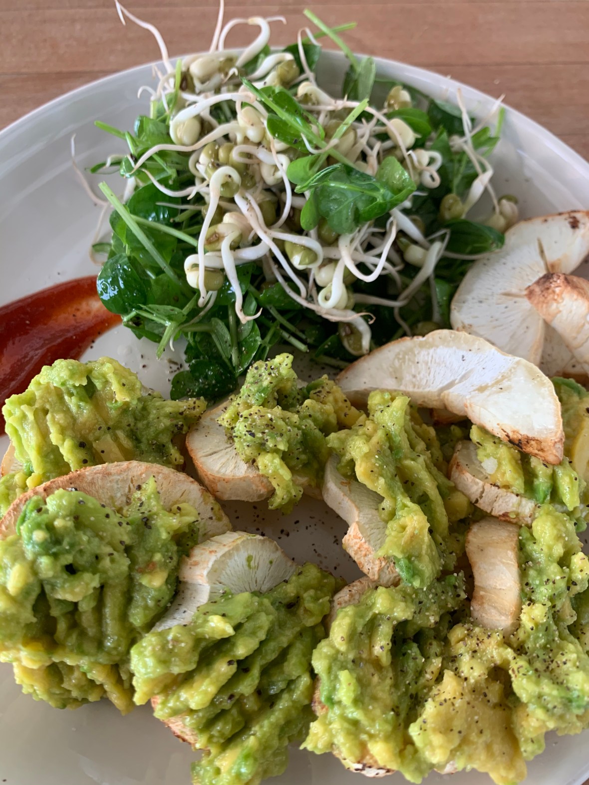 I sliced then air fried the yuca and topped this with mashed avocado and a sprinkle of truffle salt. A little splash of sriracha on the side and this was the perfect little breakfast! Woke up the taste buds and no regrets!