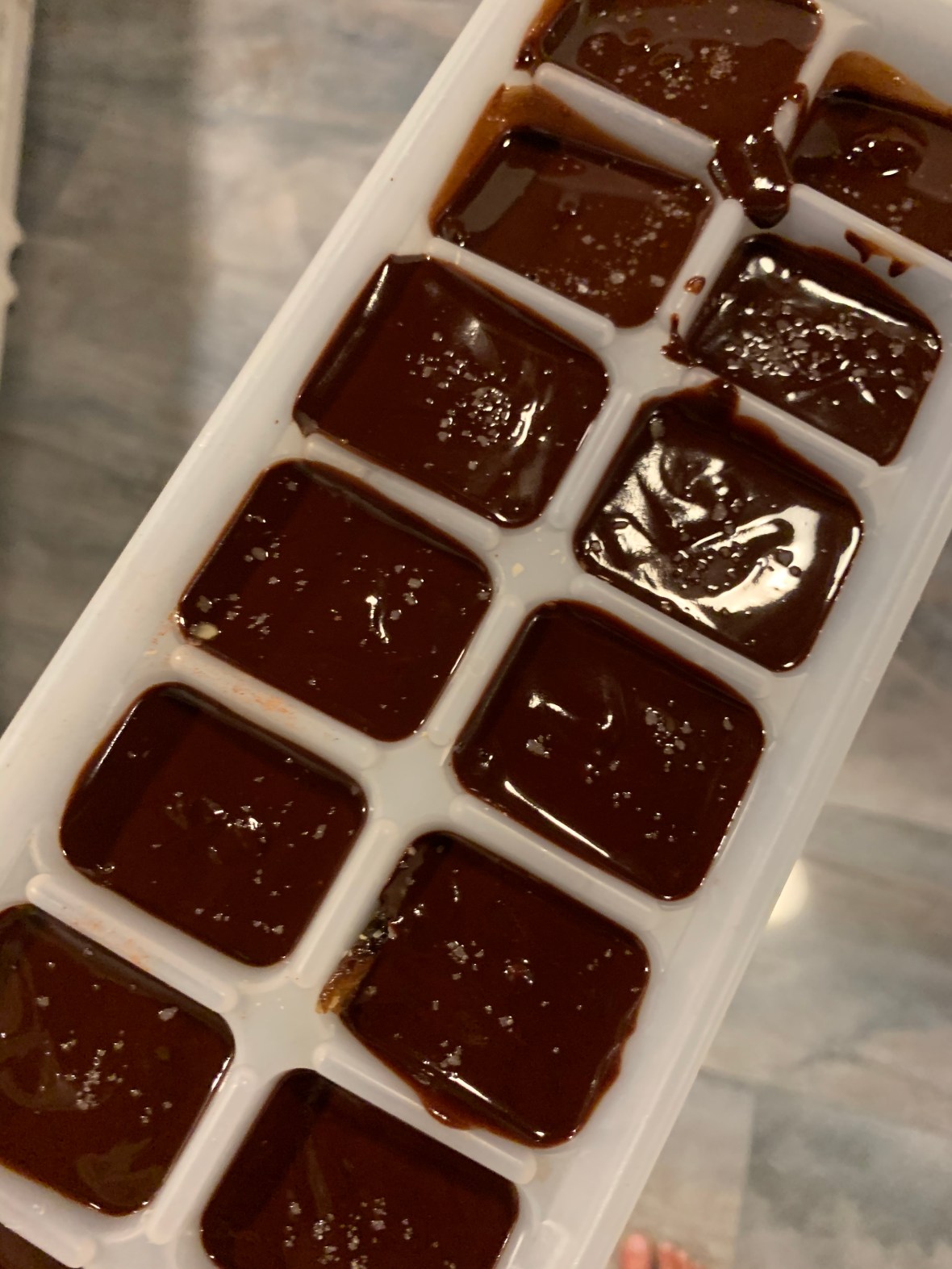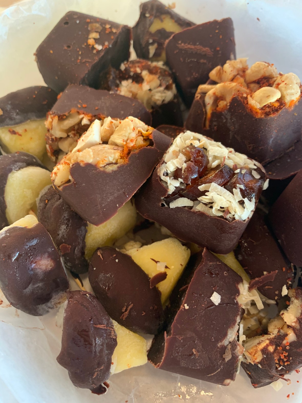 For the candy mold I used an ice cube tray. First I filled a few with a blend of walnuts and cashews, and the rest chopped dates and coconut. I sprinkled some chili lime seasoning on a few just for some added spice. Then I topped with a pinch of sea salt.