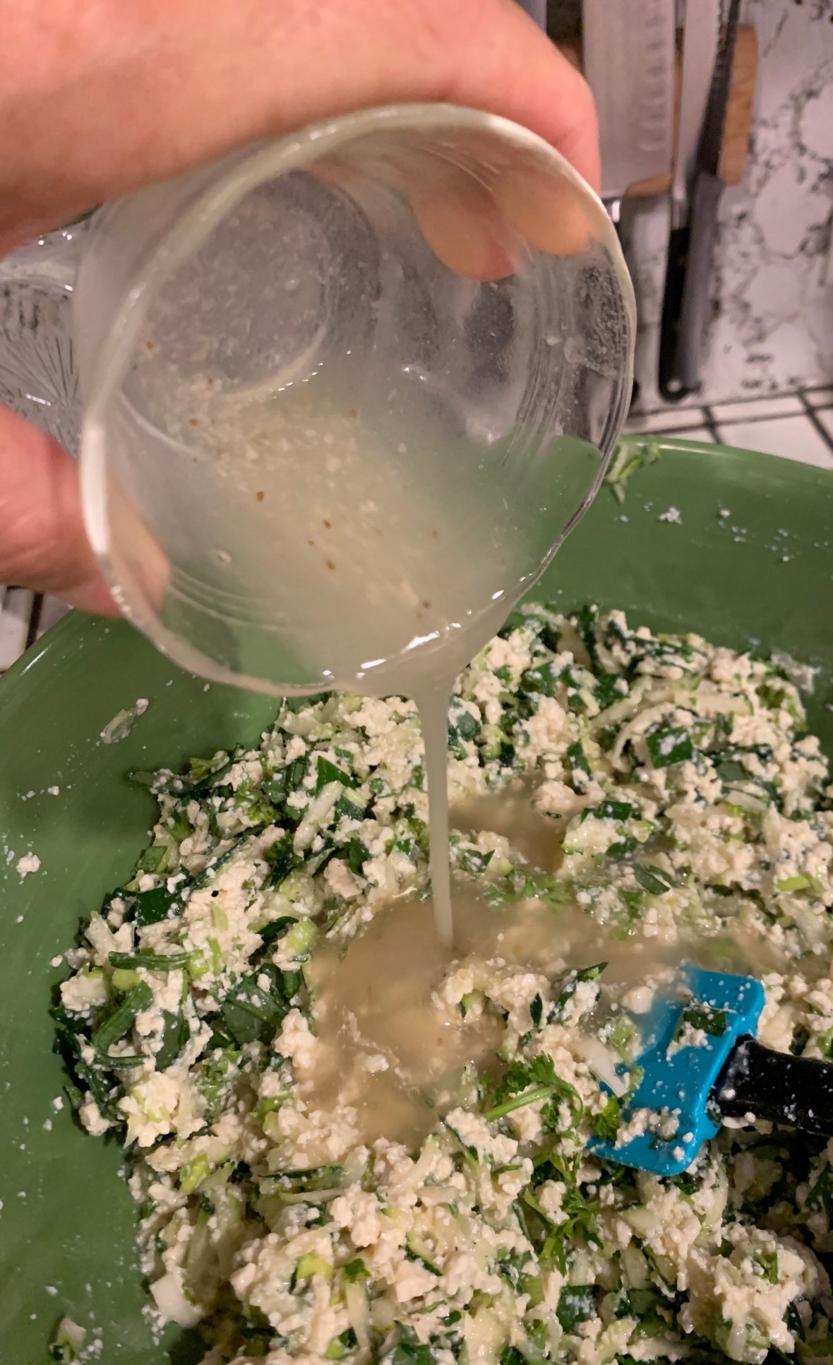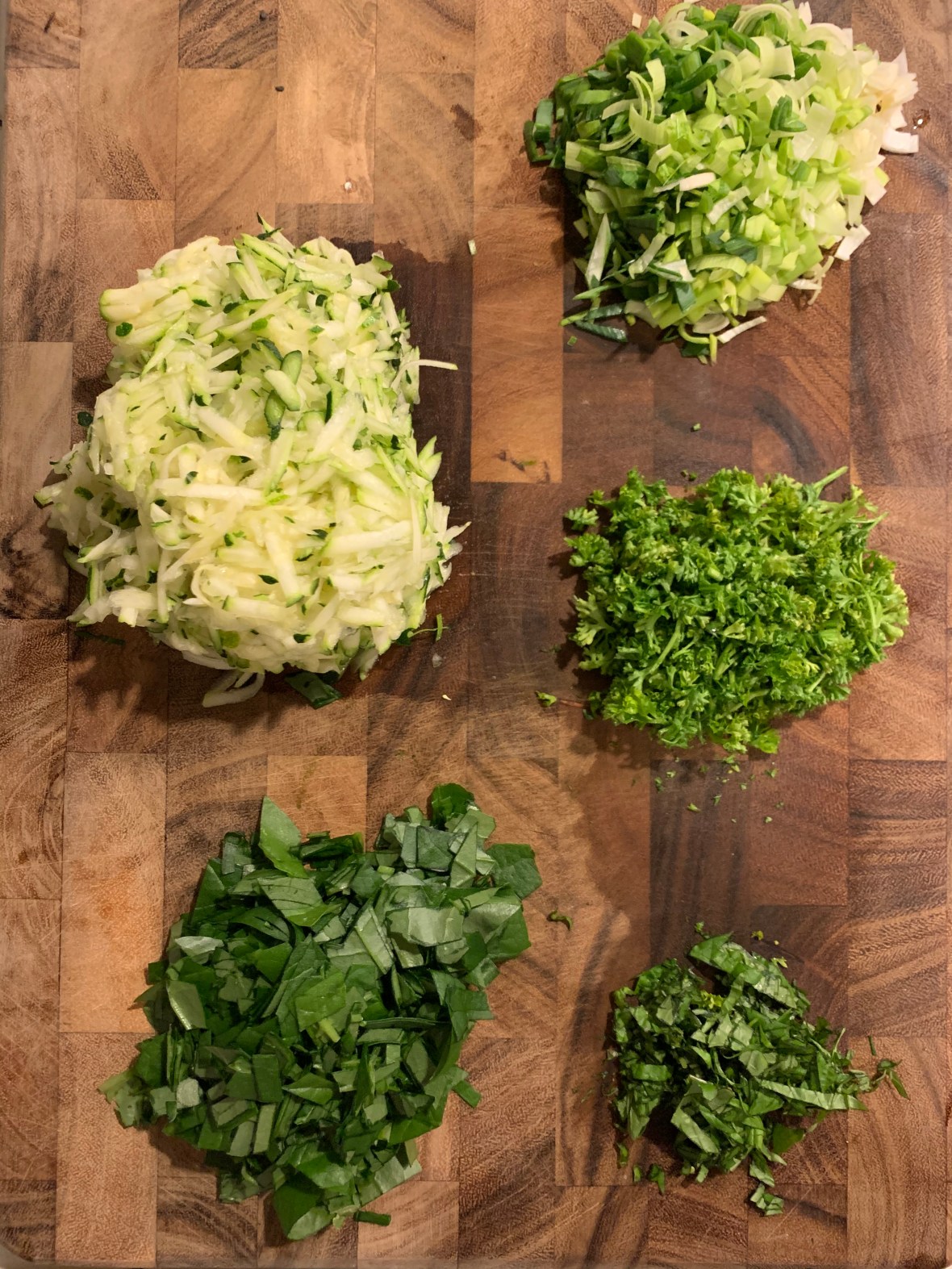 It takes longer to cook than it does to prepare! First, quickly grill 1 bunch of asparagus for the center of the frittata and set aside. Don’t over cook, just get some color – keep the asparagus crisp! When this is done, chop about a bunch each of spinach parsley, and leeks, and about half that amount of basil. Throw some salt and pepper on top and mix. Let this sit while you prepare the tofu mixture.