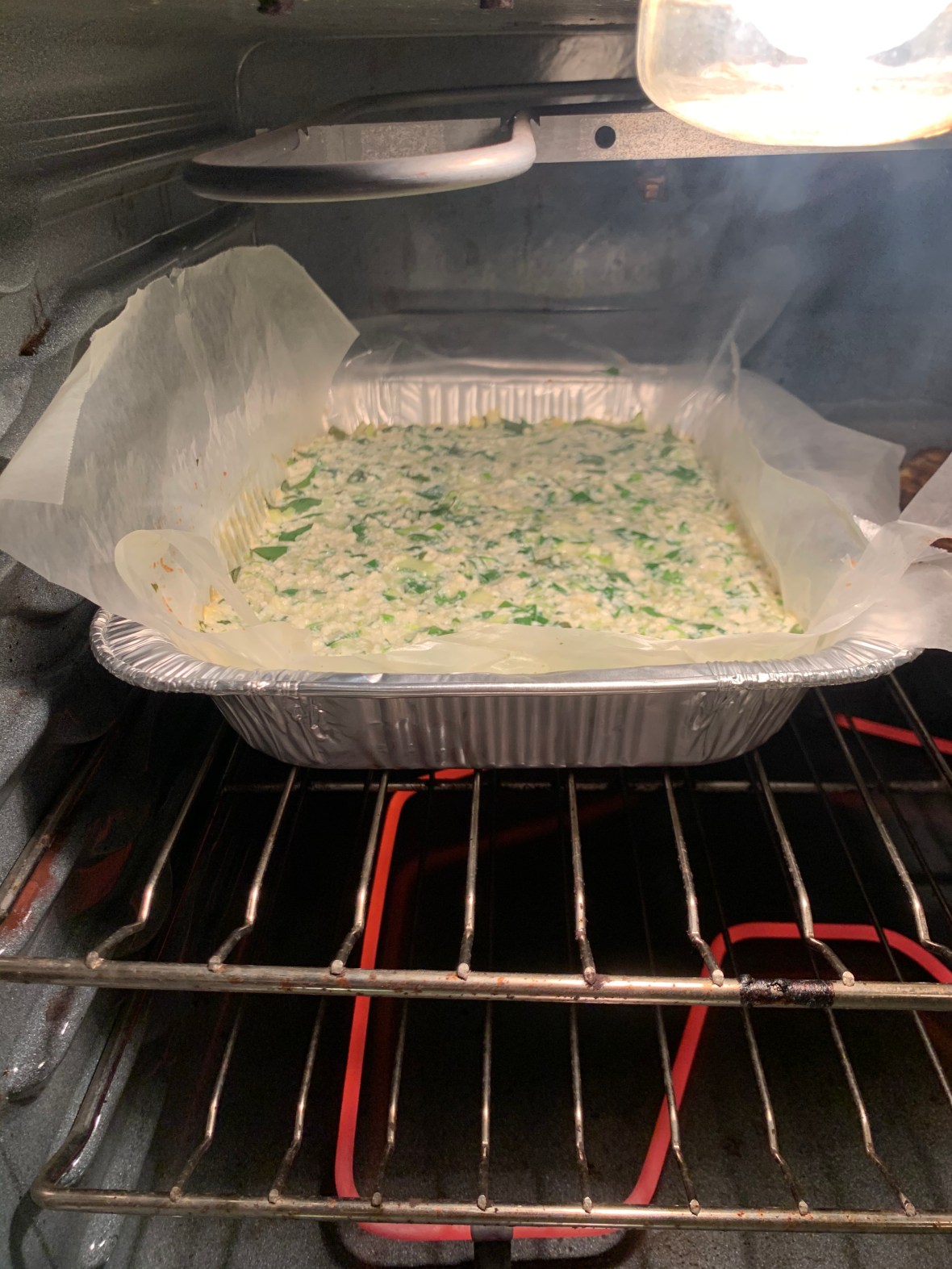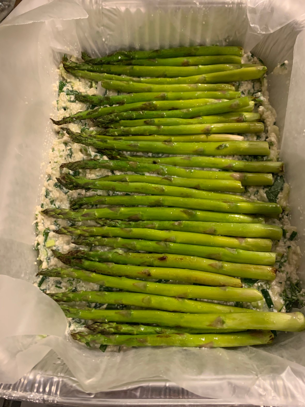 Next, add a layer of the tofu to your pan lined with wax paper. Then add the asparagus, then top with the remaining tofu mixture.