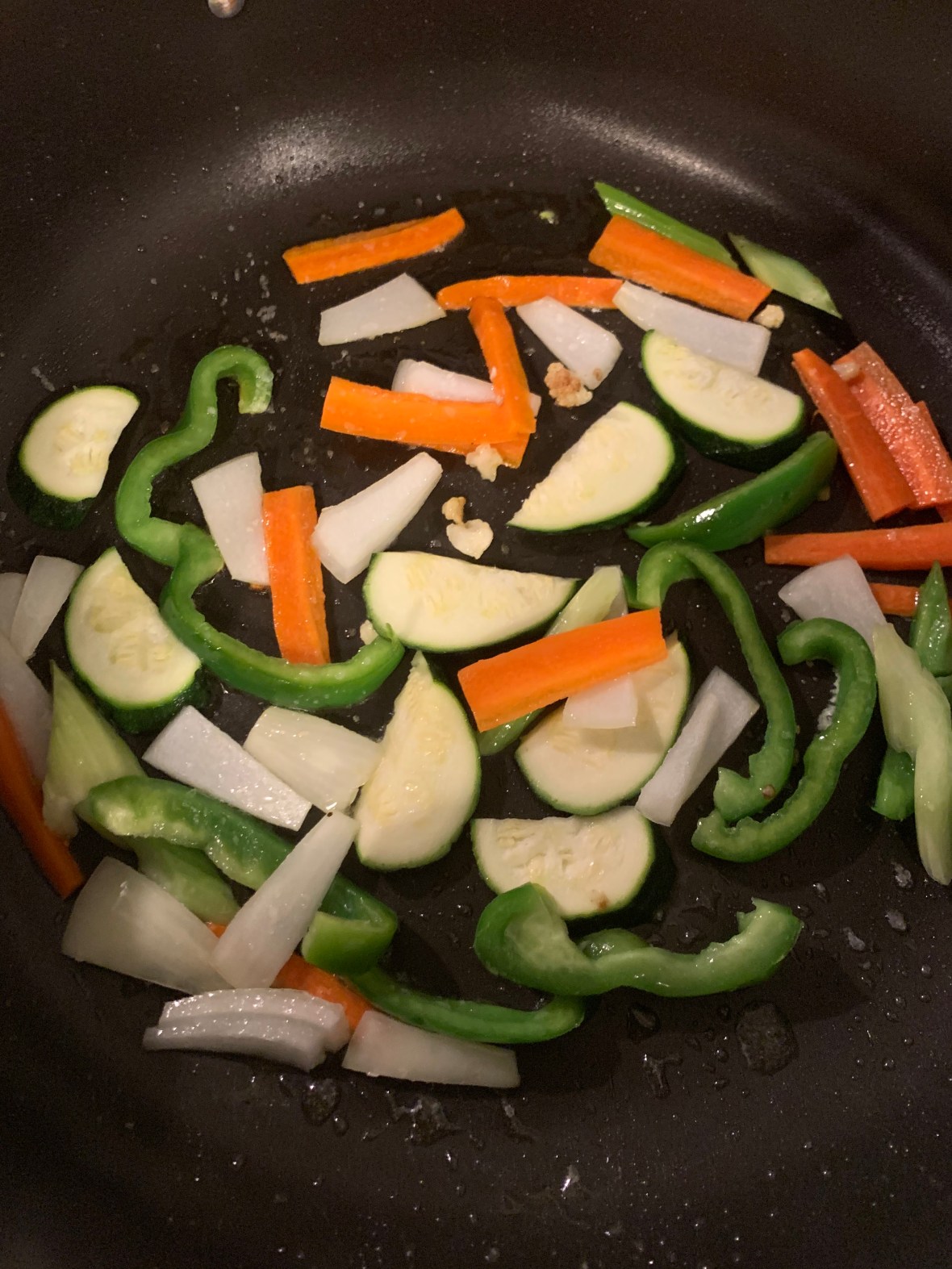 All I did was cook some short grain brown rice and sauté some veggies. Mix the sauce in with the veggies and voila – done!