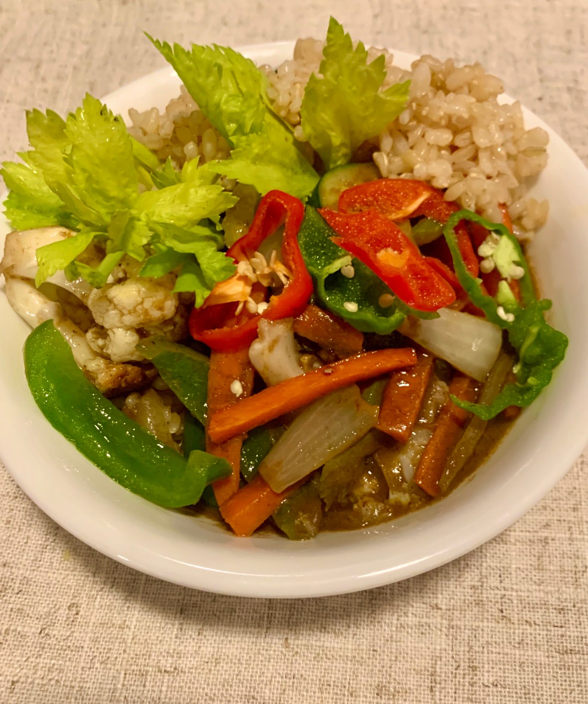 I topped with my fav garden sweet peppers and some celery sprigs. I’m not gonna lie, it’s not toooo spicy, but I did catch myself wiping the sweat off my brow toward the end of the meal! 🥵