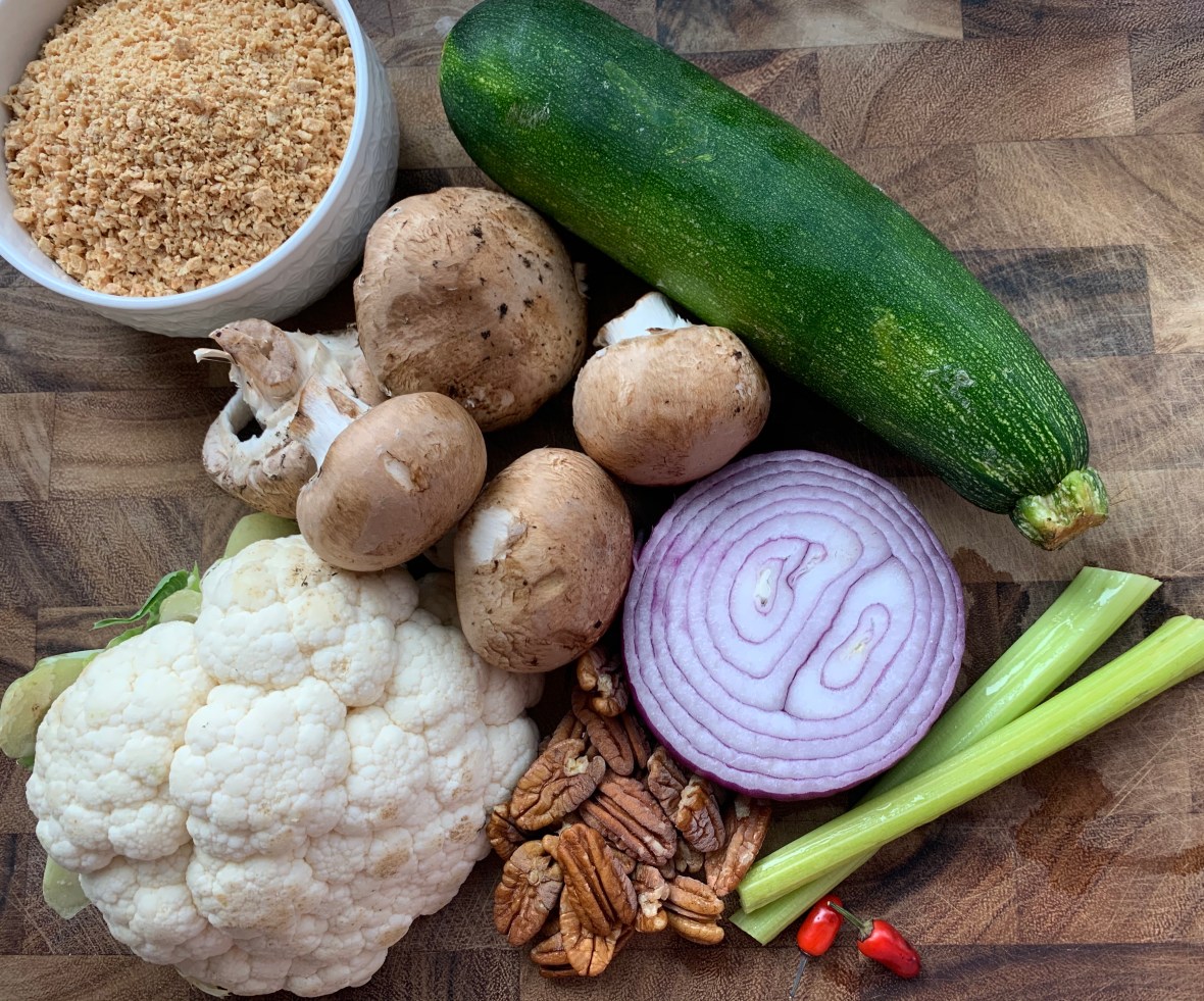 All I did was finely chop mushrooms, cauliflower, purple onion, celery, and a few red hot…hot…hot peppers 🌶 from the garden (they sweeten up as they cook). I added all this to a pan to sauté for about 5 minutes. Add a dash of salt and pepper and about 1 teaspoon of minced garlic. I also added a dash of onion powder. Once this is all sautéed down, I added in a can or organic crushed tomatoes. Once that is mixed in well I add about 1.5 cups of TVP, and another 1/2 of water. I let all this cook for another 5 minutes then threw in a handful of chopped walnuts. Turn the heat way down and let this simmer.
