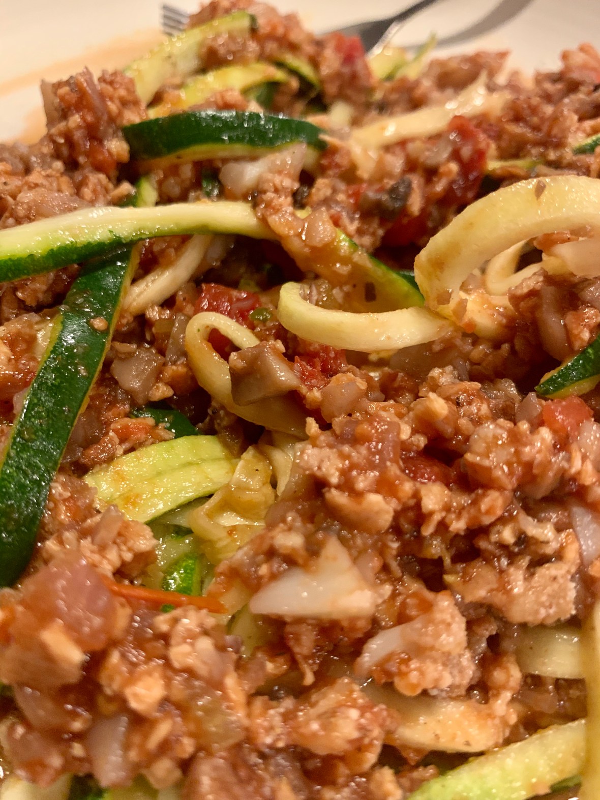 While that was happening I spirilized and then quickly sautéed my zoodles. When it was all done, I plated the zoodles and gave myself a heaping spoonful of the veggie bolognese delight!!!
