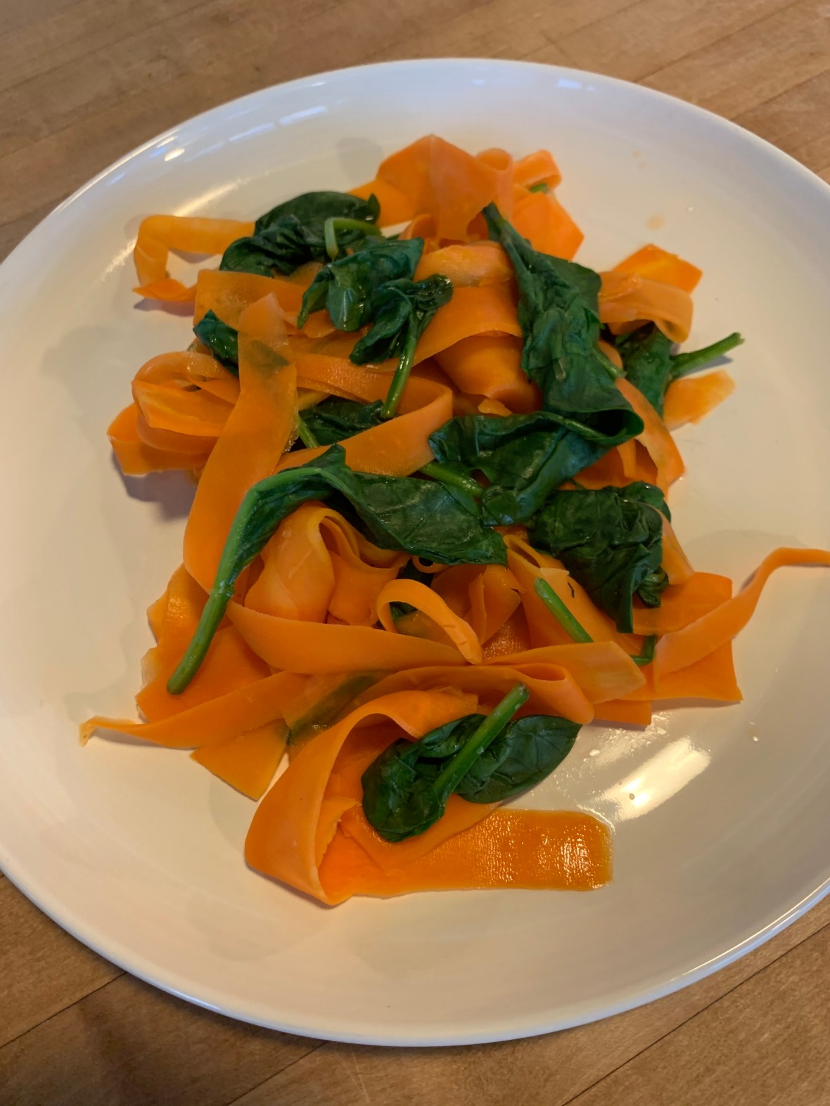 All I did was thinly shave a medium carrot with a peeler then piled them up in a steamer with a dash of salt for about 3 minutes. Then I added in about a cup of spinach to make sure I got in my greens!