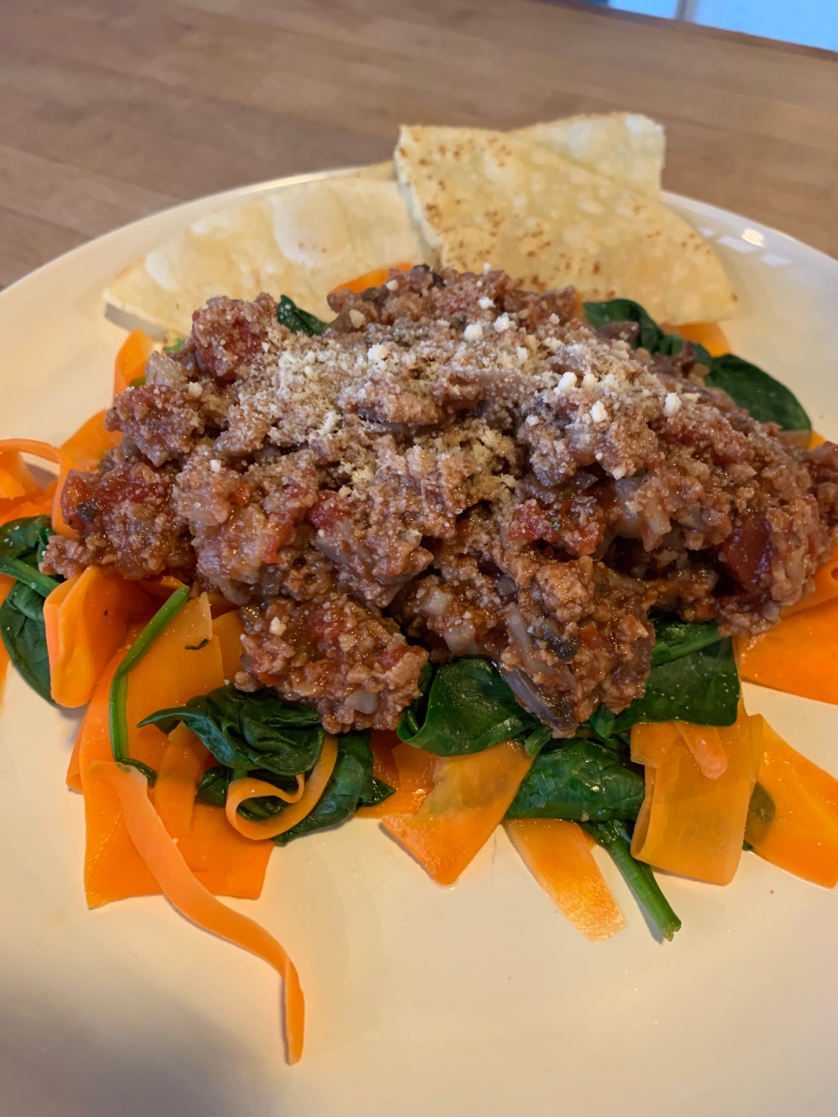 I used leftover veggie bolognese sauce to top and quickly toasted an almond wrap with a pinch of garlic for dipping.