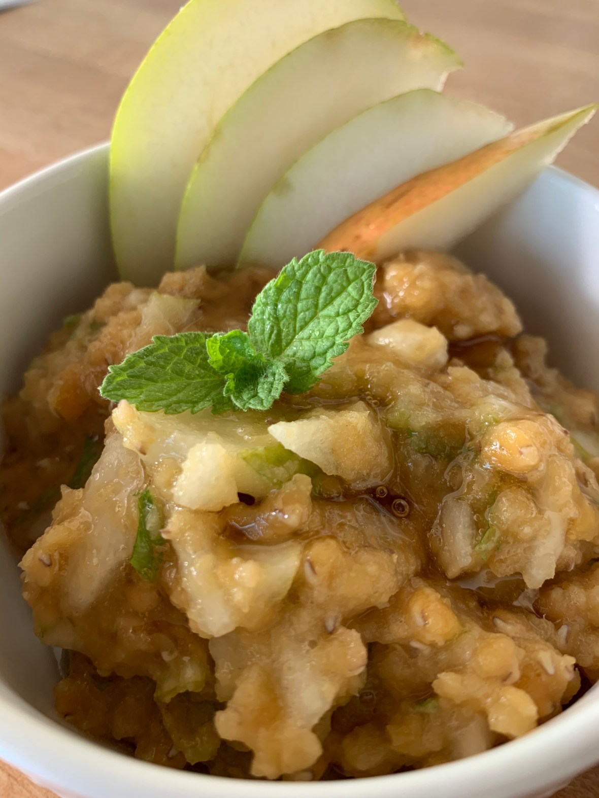 This red lentil and pear bowl is the perfect solution. Definitely filling but all good for me! Lentils are PACKED with protein, are rich in iron and low in calories. Pears are rich in antioxidants and dietary fiber, and are fat and cholesterol free. Fresh mint from the potted garden is a delicious addition that improves brain function and digestive symptoms.