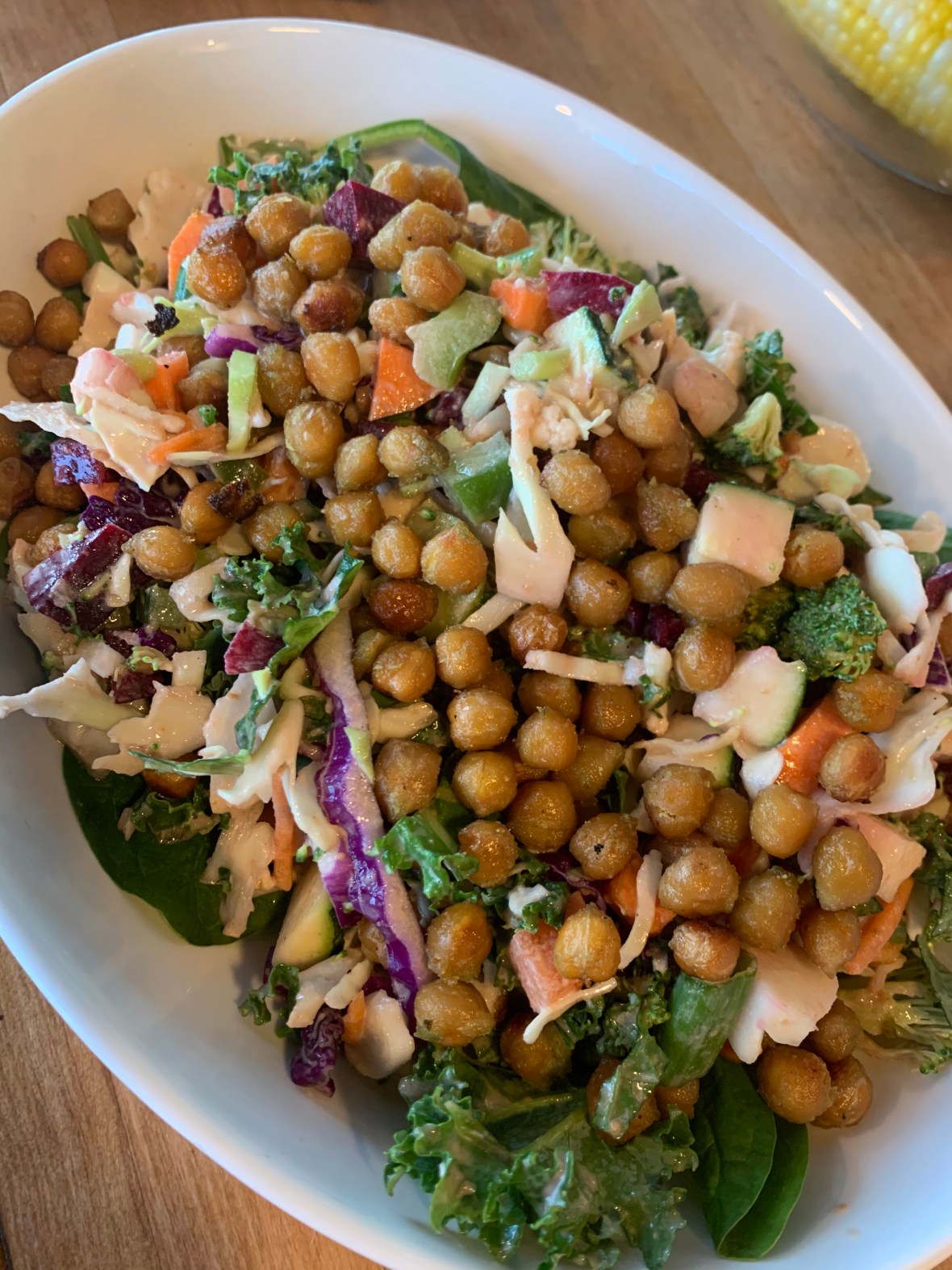 This raw Thai salad is soooo simple! First, for a crunchy spicy treat on top I mixed about 1.5 tablespoons of wasabi paste with equal amount oil and 1 tablespoon water. Pour this over 1 cup garbanzo beans and mix. Roast these on 425 for 15-20 minutes. Stirring as needed.