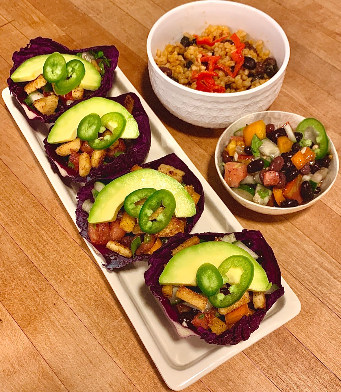 I did whip up some temphe for some extra protein and topped the wraps with a few pieces each, an avocado slice and jalapeño slivers. We had some left over rice and beans from Mexican night on Friday so I warmed some of up to have on the side.
