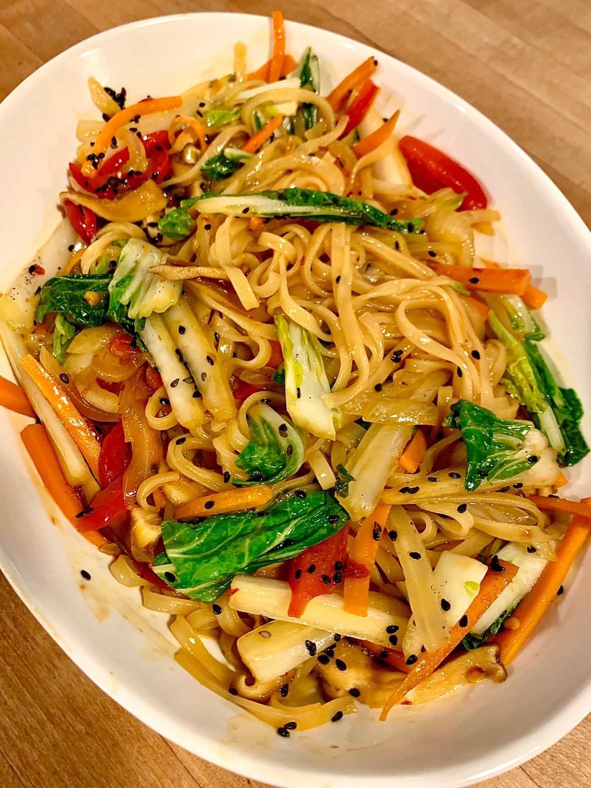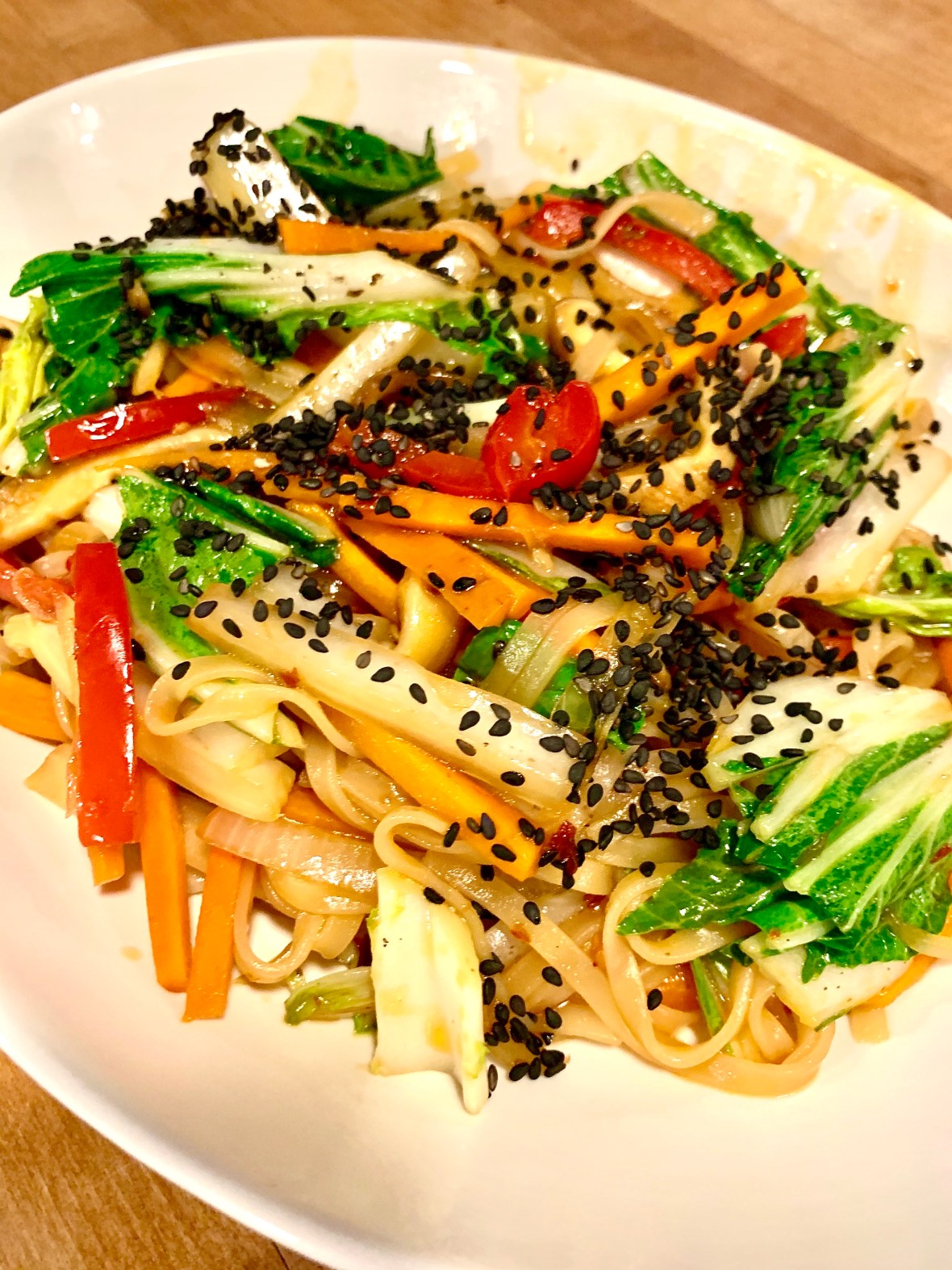 Japchae is simply a Korean stir fry with rice noodles. Traditional vegetables are white onion, carrot, red pepper, shiitake mushrooms and bok choy. All but the bok choy are sautéed quick, don’t overcook, in sesame oil. We are talking maybe 3 minutes.