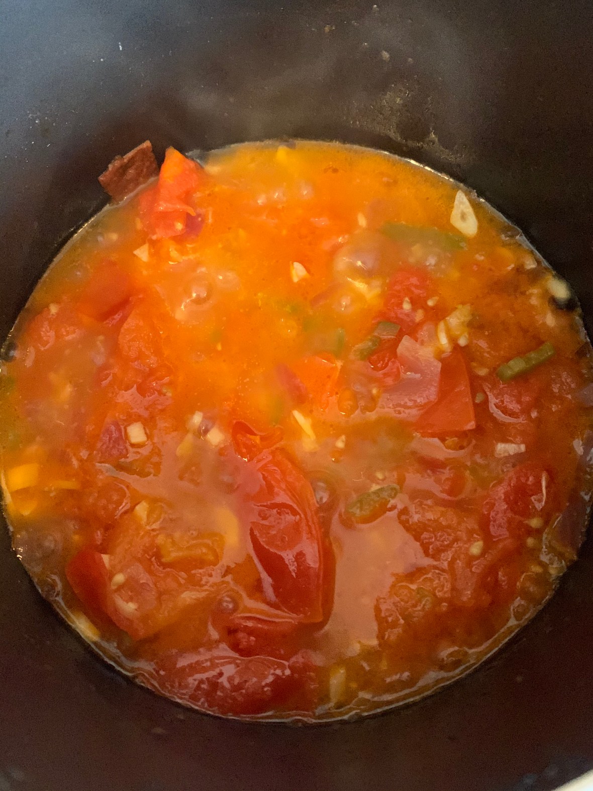 But first, I made my own stewed tomatoes to add to the dish by cutting up fresh beef steak tomatoes, jalapeño, garlic, salt and pepper and letting that boil for about 15 minutes. Then let it simmer until we are ready for it.