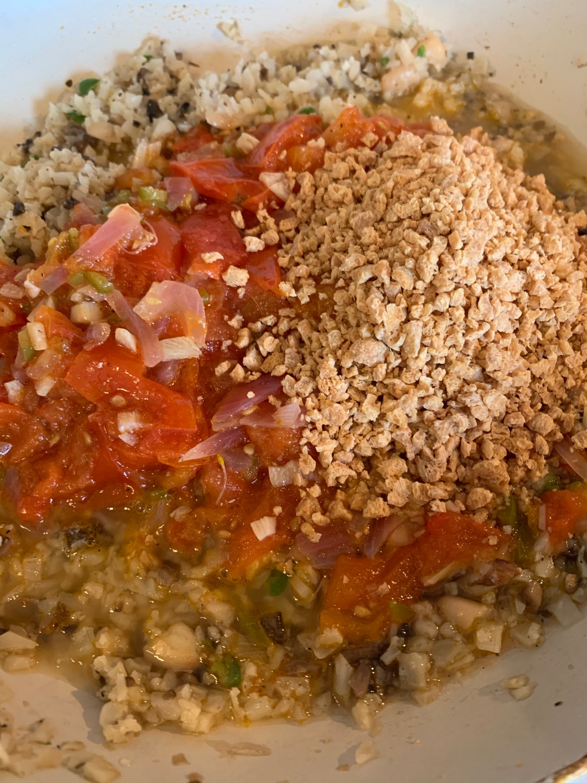 While that was happening, I sautéed mushrooms, more jalapeño and cauliflower, onion powder, garlic powder, salt, pepper and a little bit of cumin powder.
