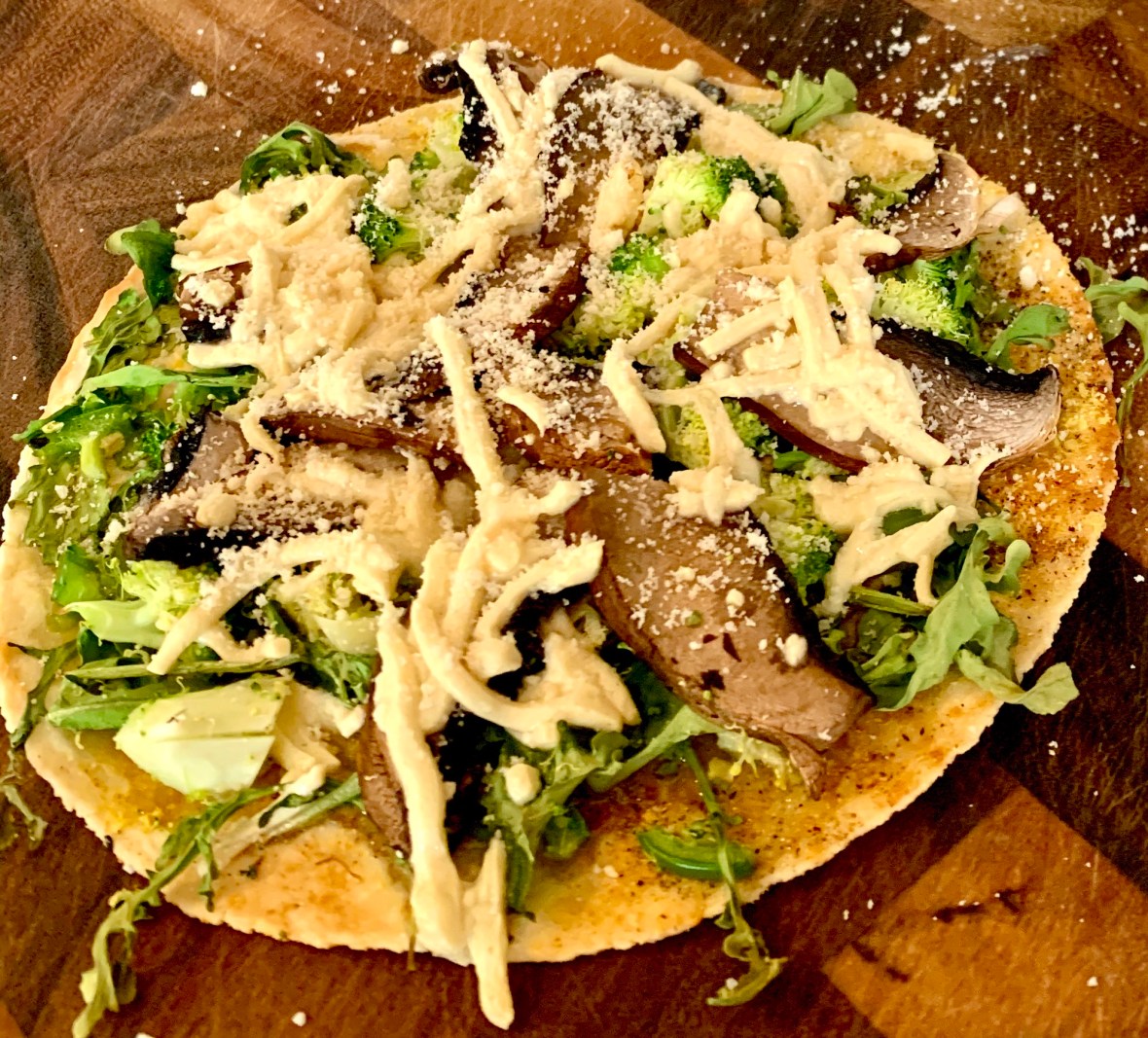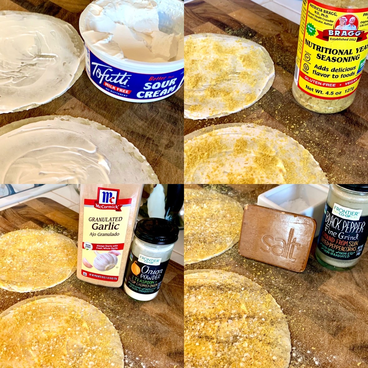 First, we start with a Siete Almond Wrap. Next, for the “sauce” – top the wrap with a tablespoon or two of Tofutti sour cream. Next, sprinkle with Braggs Nutritional Yeast. This gives you the cheesy flavor so add as much as you want! Now, add garlic and onion powder, and last, some salt and pepper.