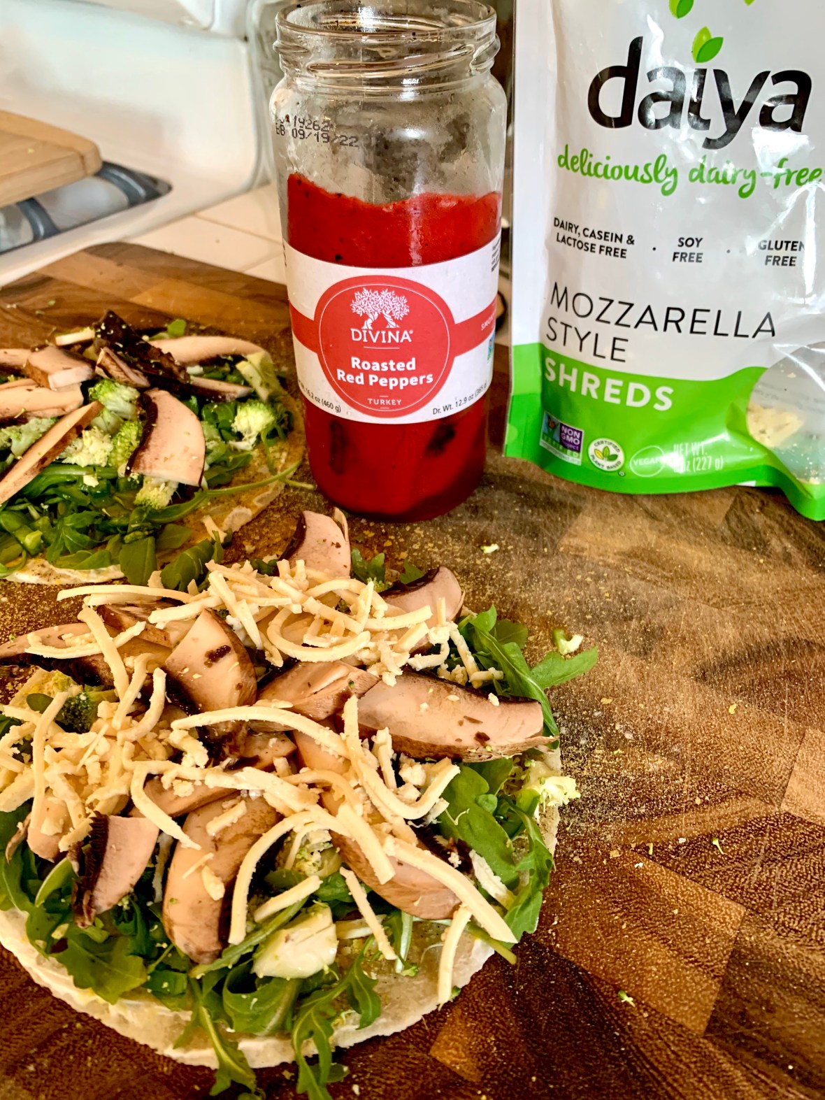Top with a little bit of Daiya mozzarella shreds, and then the magic – a sprinkle of oil from a jar of roasted red peppers!