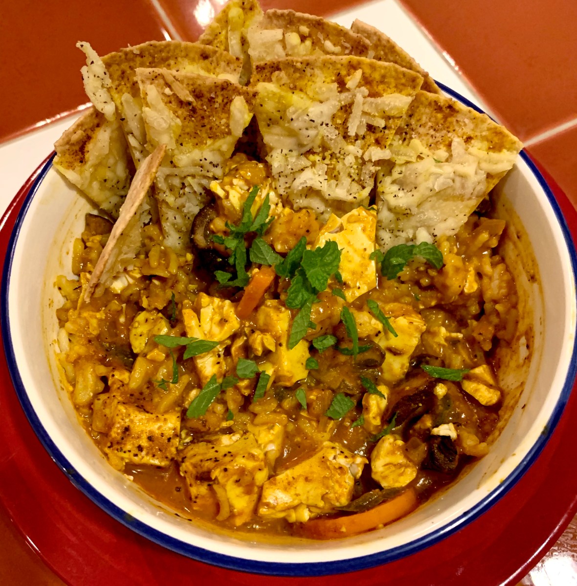 I used cauliflower rice as my base. I coated a cashew wrap with avocado oil then sprinkled on the garlic powder, cumin and turmeric. Then topped with almond cheese.