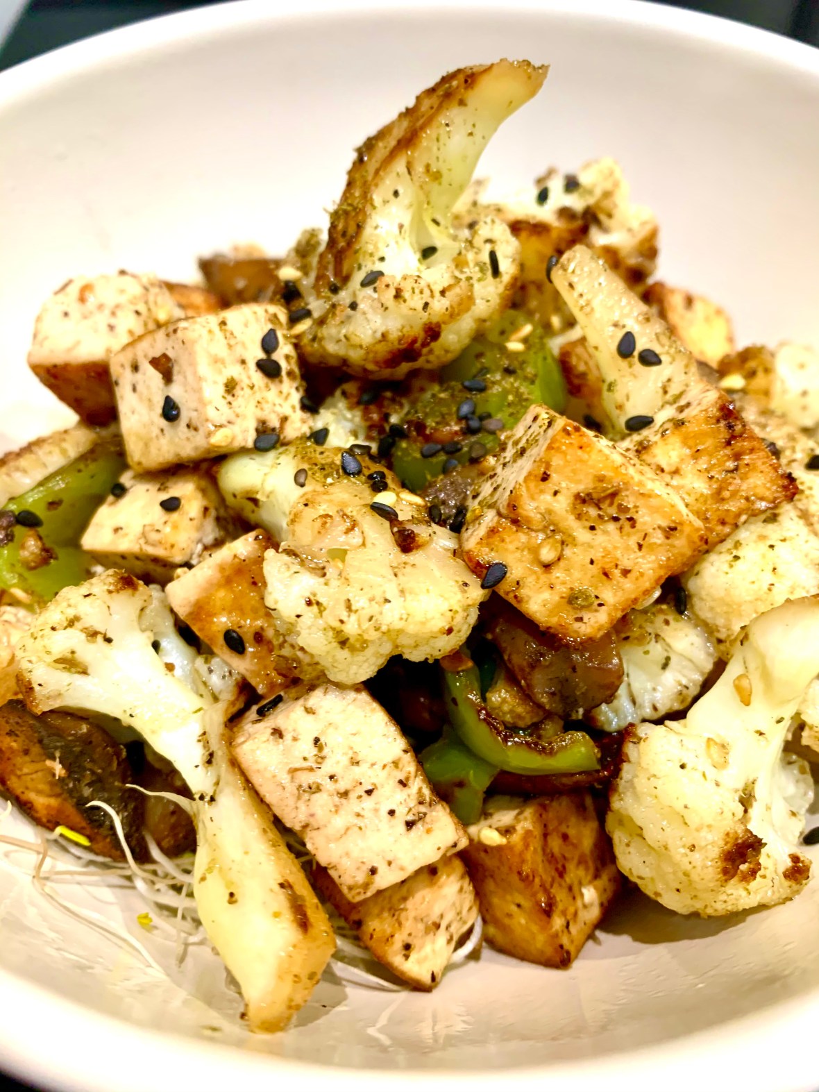 All I did was sauté cauliflower, sliced button mushrooms, 1 Cubanelle pepper from the garden and 1/4 block of tofu in avocado oil, and a heavy sprinkle of za’atar, maybe 3 teaspoons.