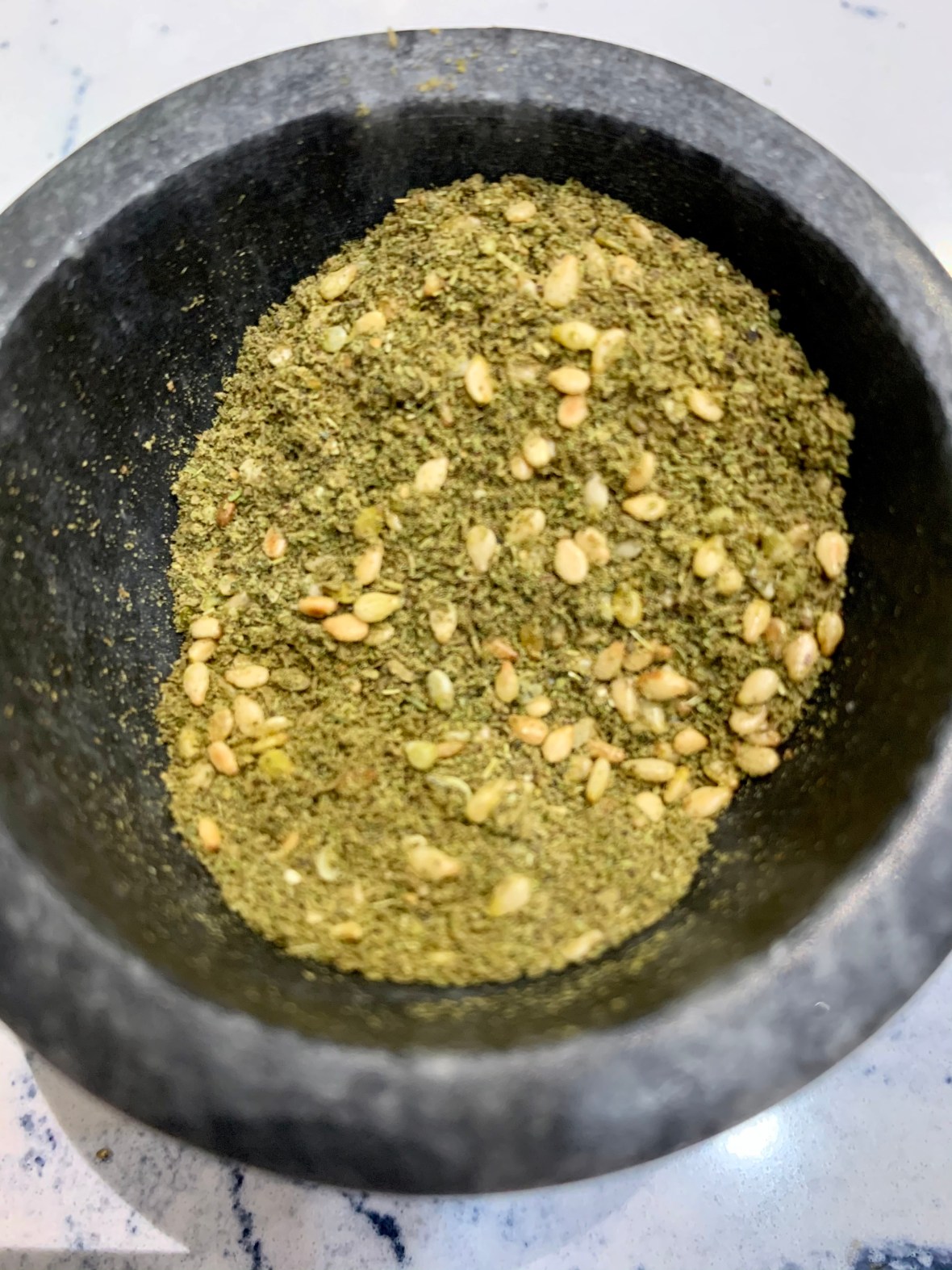 The recipes can differ but in general it’s a combination of dried oregano, thyme, and/or marjoram (woodsy and floral), with sumac (tangy and acidic) and toasted sesame seeds (nutty and rich). My blend consists of marjoram, sesame, chickpea. Salt, mint, coriander, Anis and Cumin.