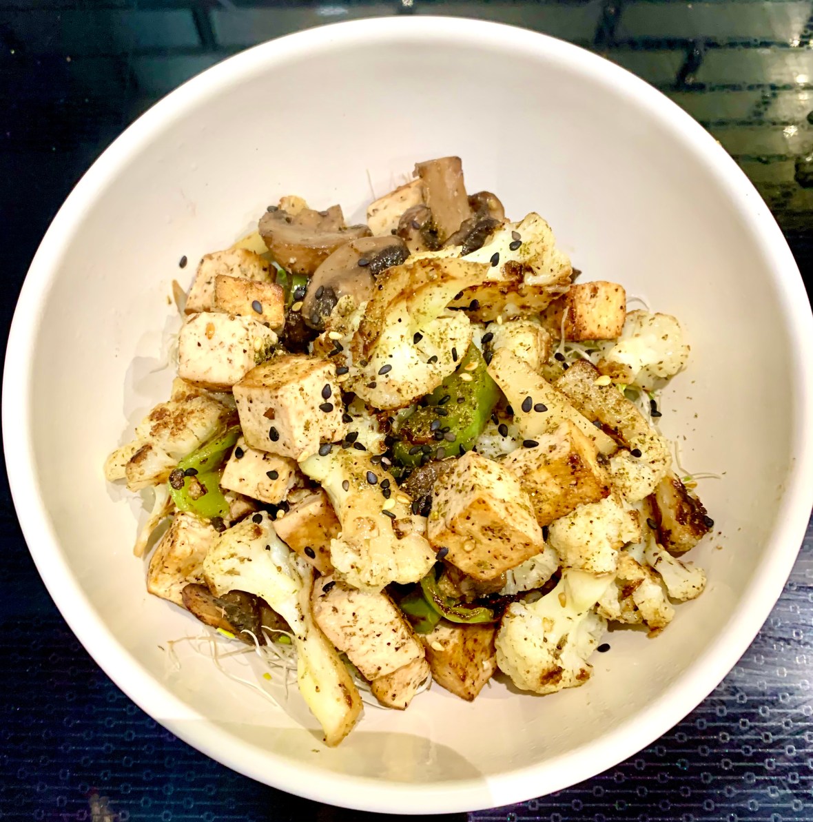 All I did was sauté cauliflower, sliced button mushrooms, 1 Cubanelle pepper from the garden and 1/4 block of tofu in avocado oil, and a heavy sprinkle of za’atar, maybe 3 teaspoons.