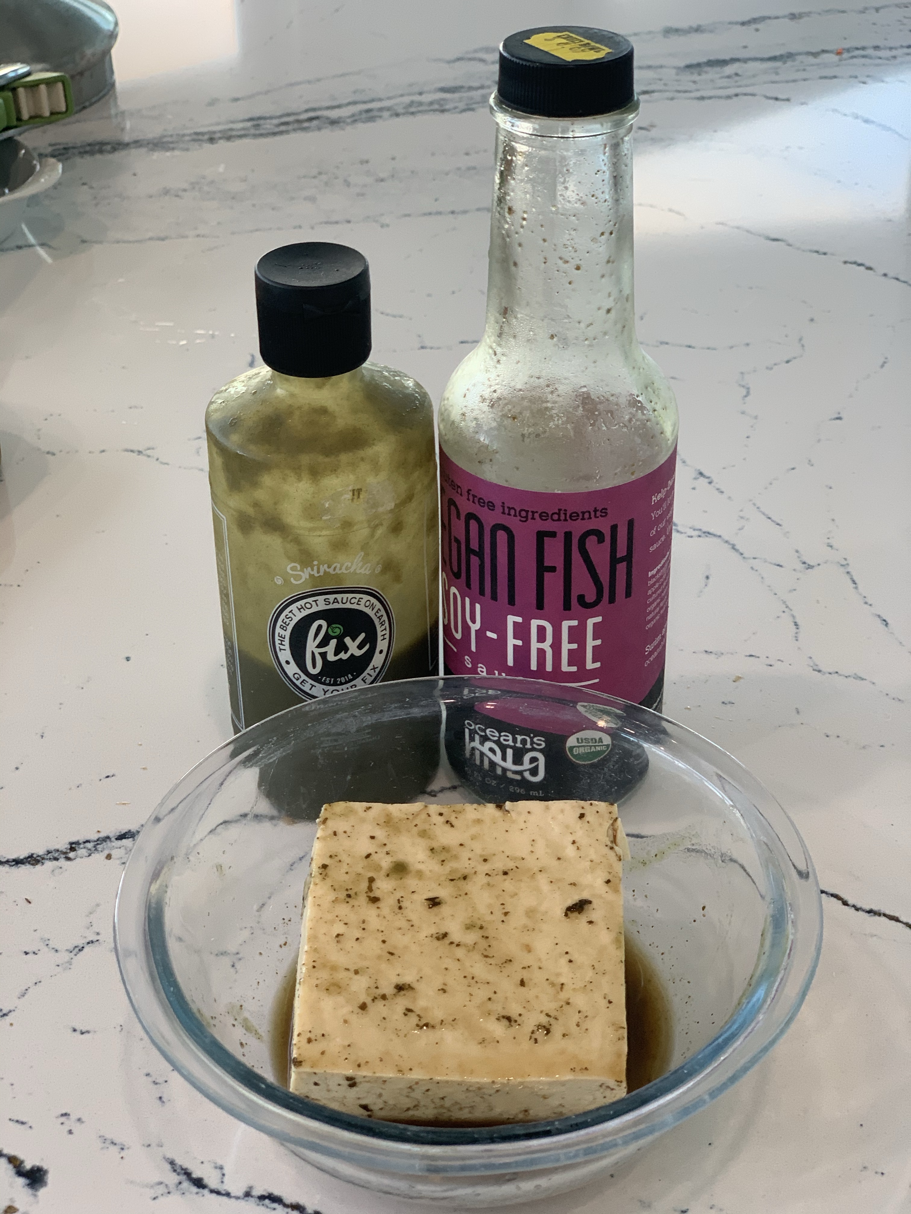 - Now, quickly marinade your protein. I used tofu, marinated in fish sauce and green jalapeño sriracha – so yummy and the perfect compliment to this spicy dish!