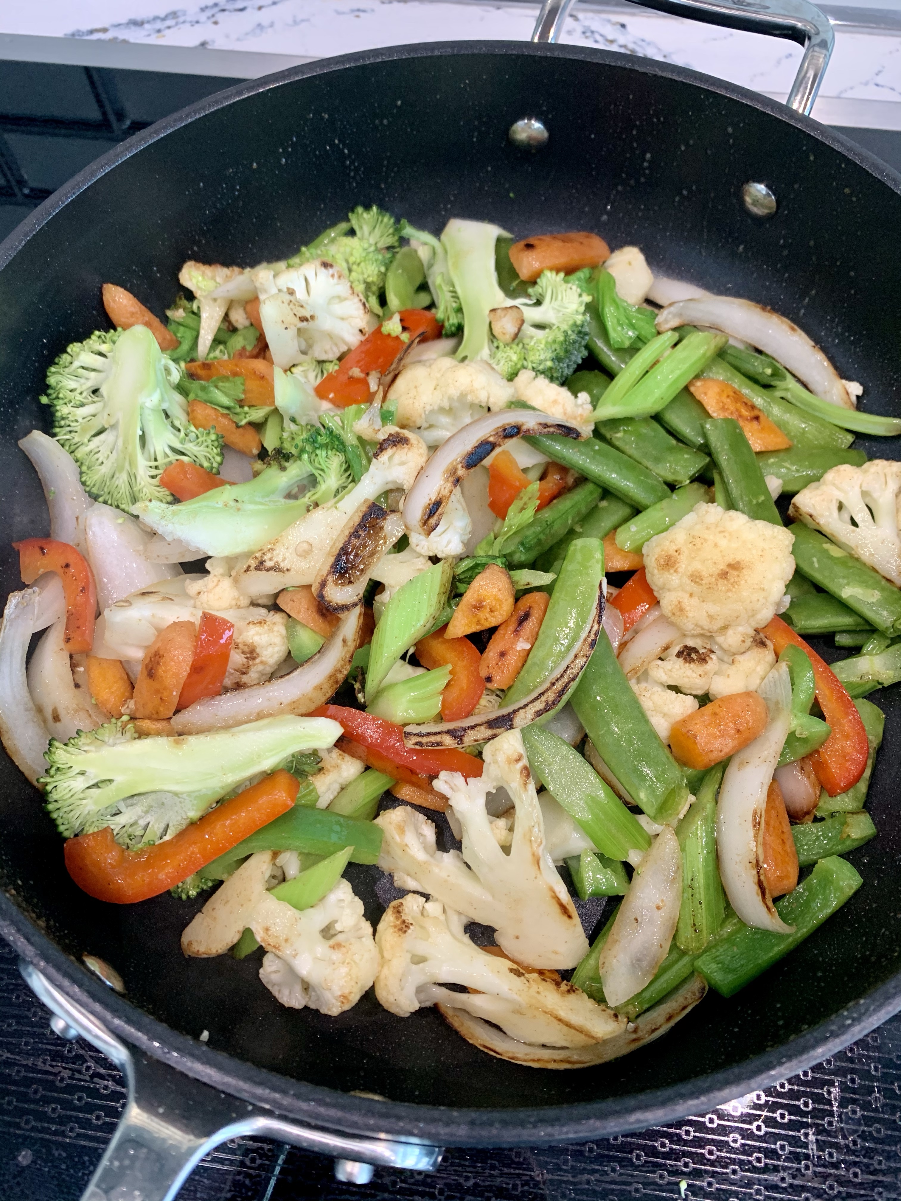 - Continue to add your veggies to the sauté in order of hardness to ensure they all wont get to soggy. This dish calls for CRISP veggies, turn the heat off a few minutes before you think they are done.