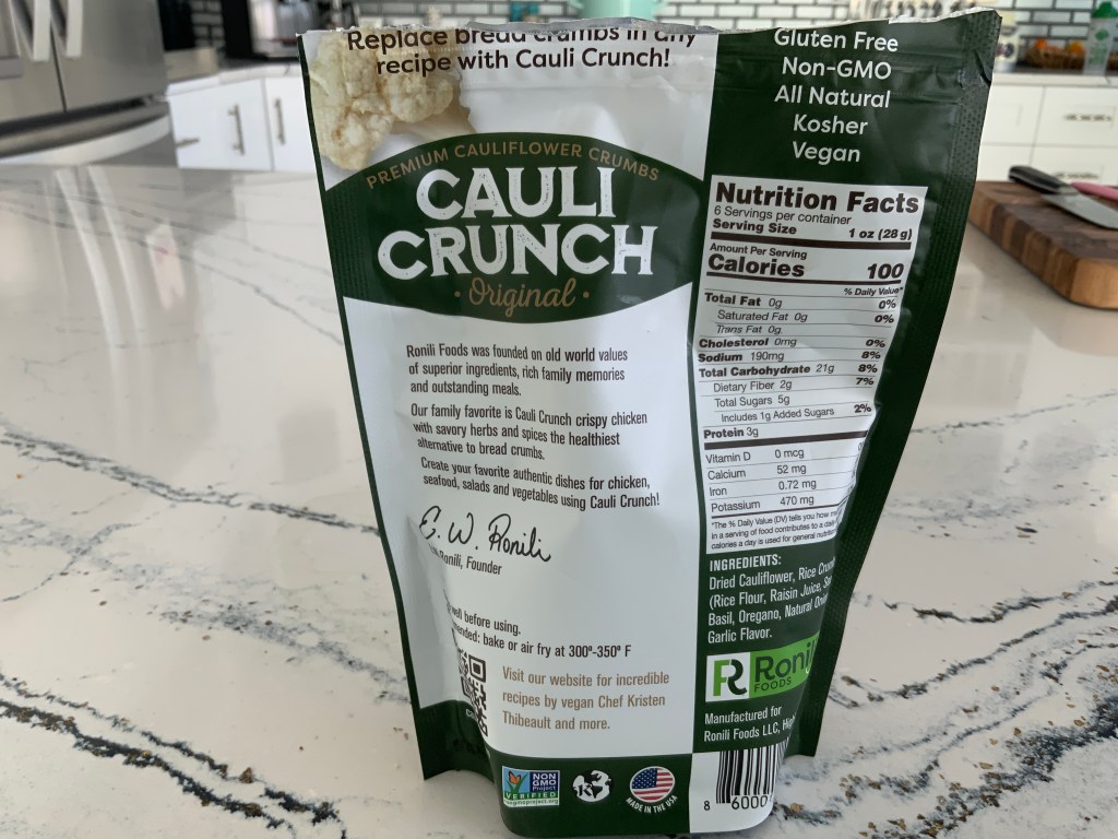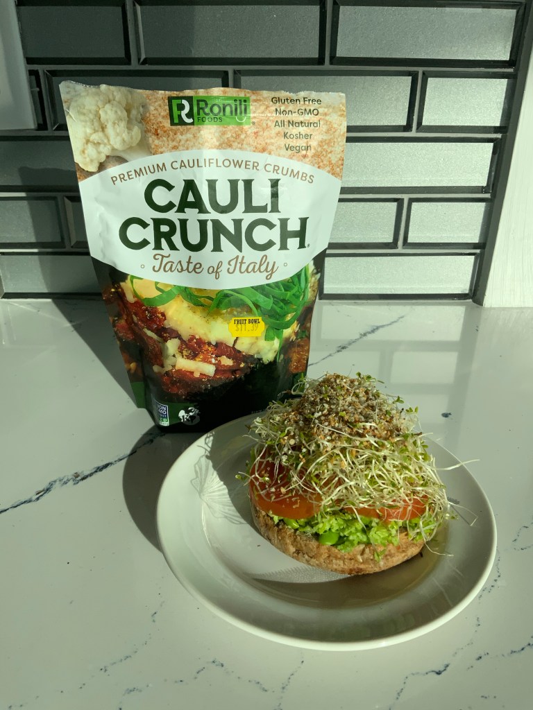This was quite the find at my local grocery store, believe it or not (in case you have forgotten, I’m in the US Virgin Islands). Cauli Crunch is a crumb that can be used so many ways! I sprinkle on my salads, on top of my tartine, in my tofu scrambles, I toss my vegetables in them before putting them in the convection oven for a little crunch, etc…so many uses! All natural and perfectly good for you!