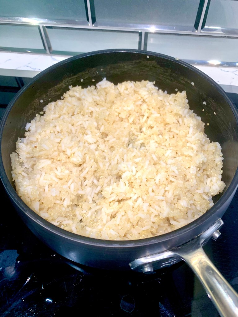 First, I thought I’d mix it up a bit and add some quinoa to my rice. It doesn’t mess with the texture but adds a bit of protein!