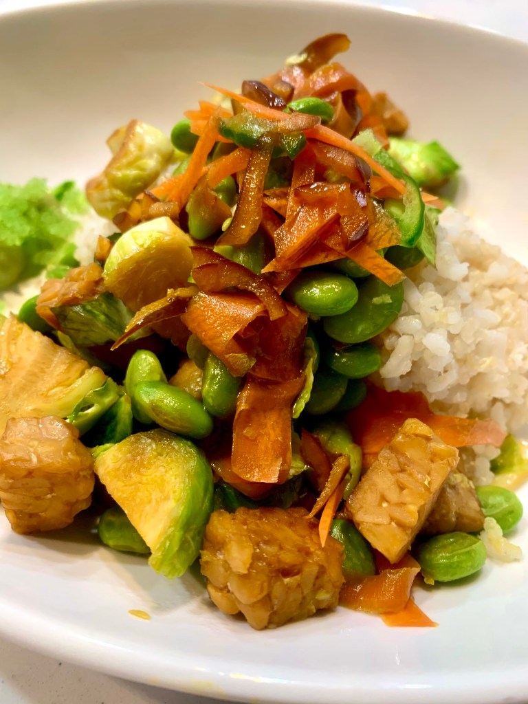 Sauté the tempeh for 3 minutes in avocado oil, then add in the Brussel sprouts. About 2 minutes later add in the rest of the veggies and let it all cook for 4 minutes.